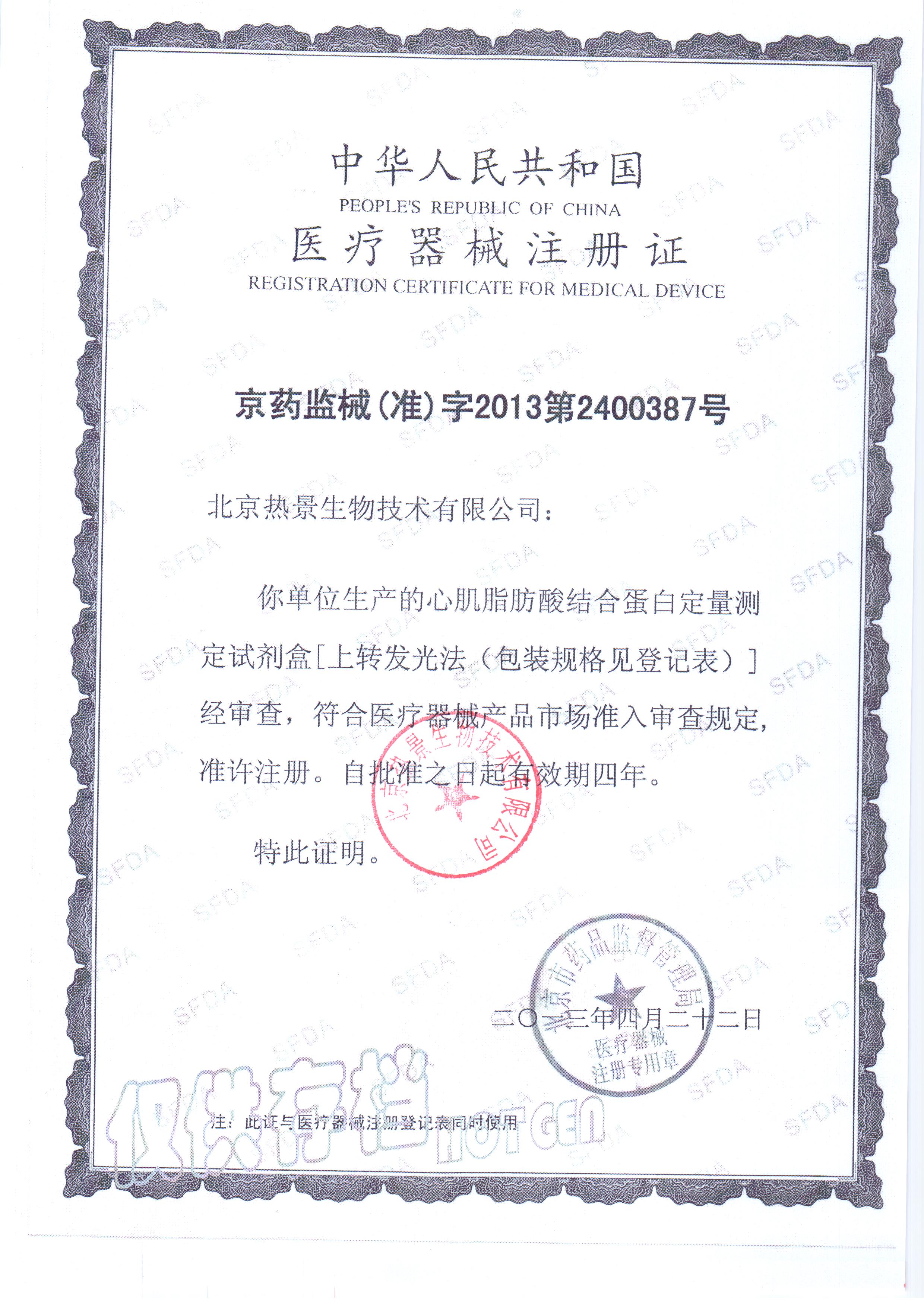 通过多人的共同努力,热景生物心肌脂肪酸结合蛋白定量测定试剂盒(上转发光法)获得医疗器械注册证,注册证号:京药监械(准)字2013第2400387号。
