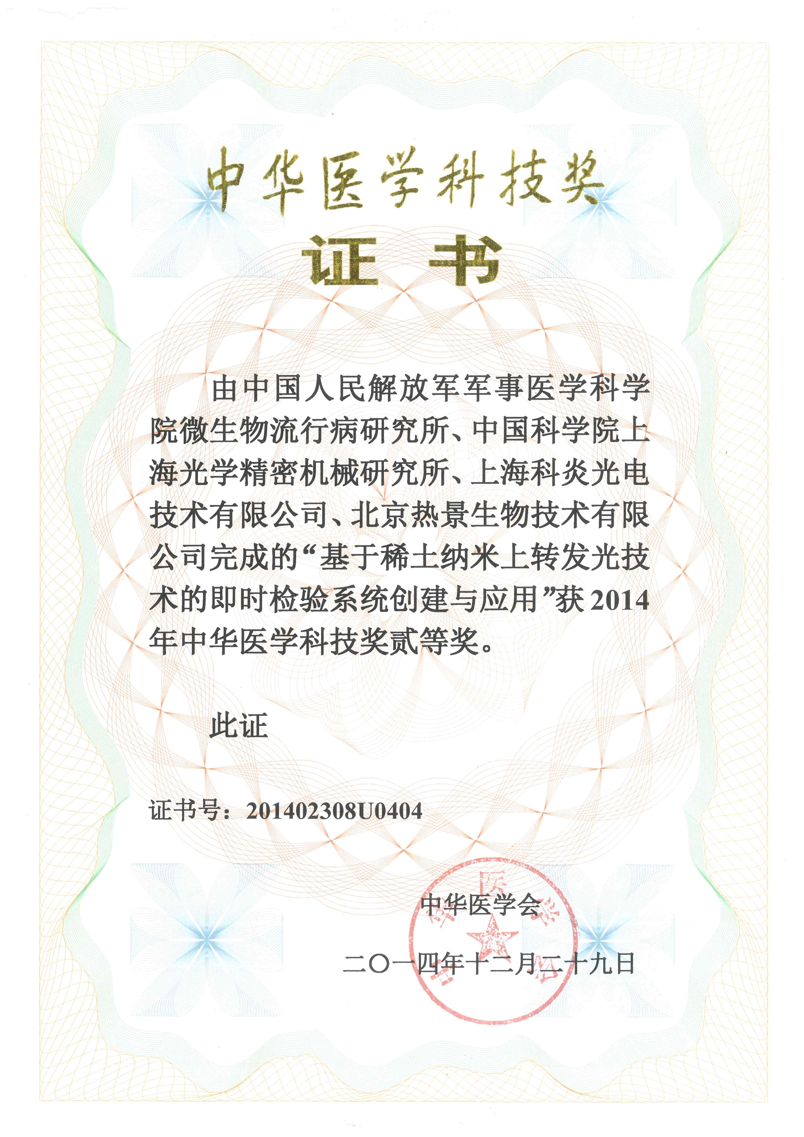 由九游网页版·官方版在线入口技术有限公司参与完成的“基于稀土纳米上转发光技术的即时检验系统创新与应用”荣获2014年中华医学科技奖贰等奖。