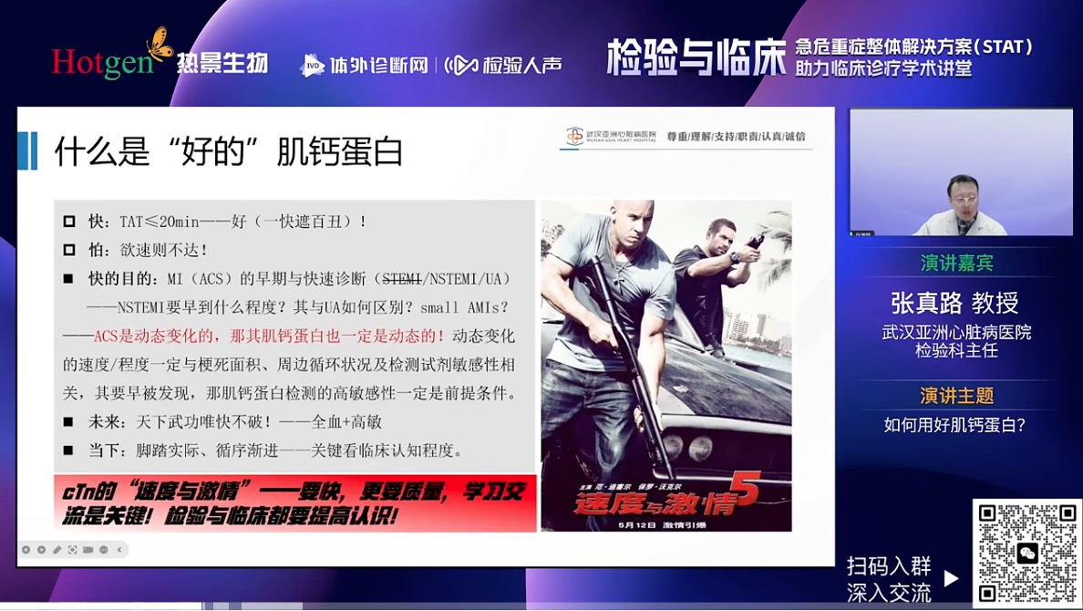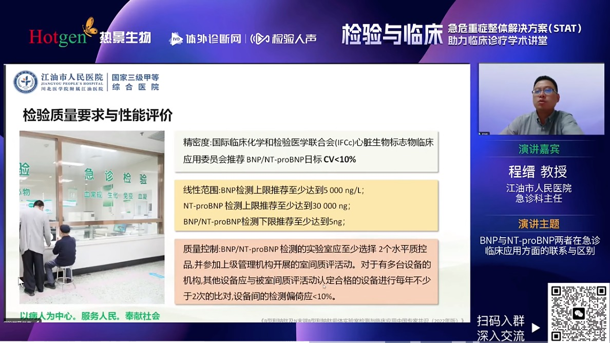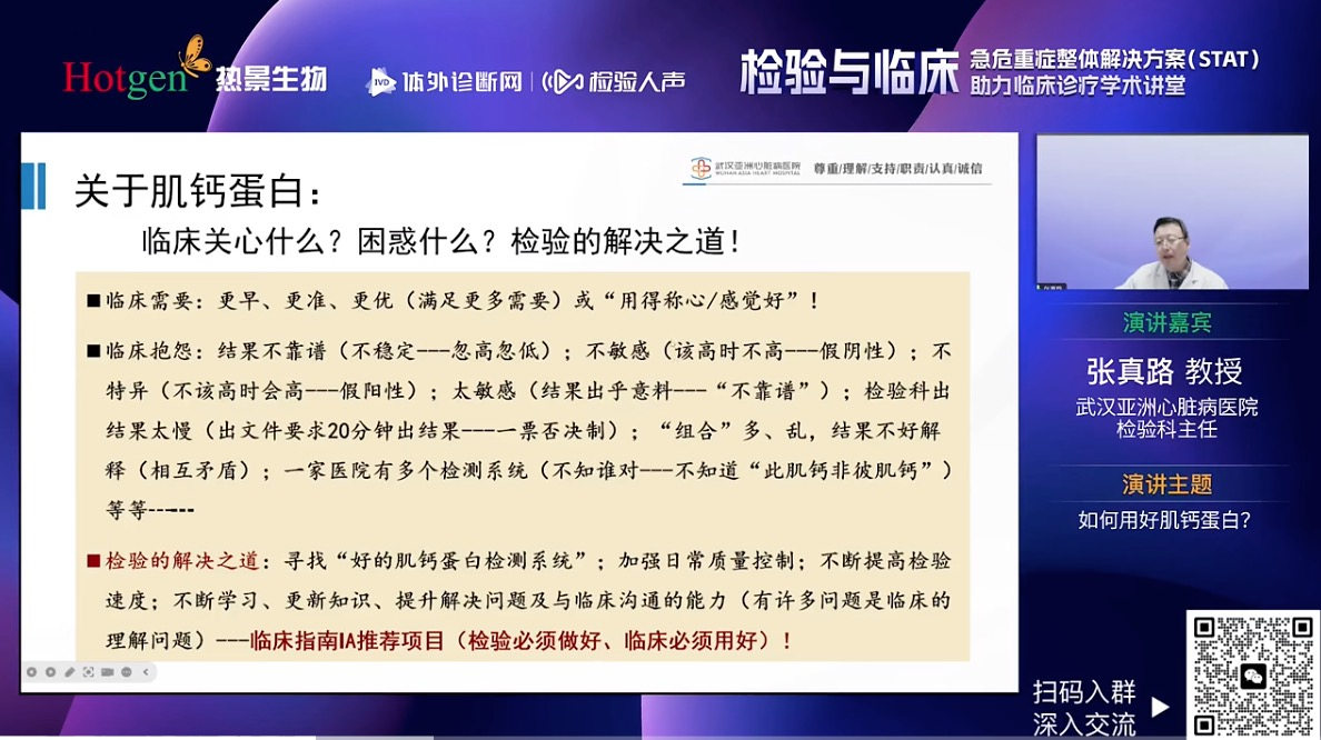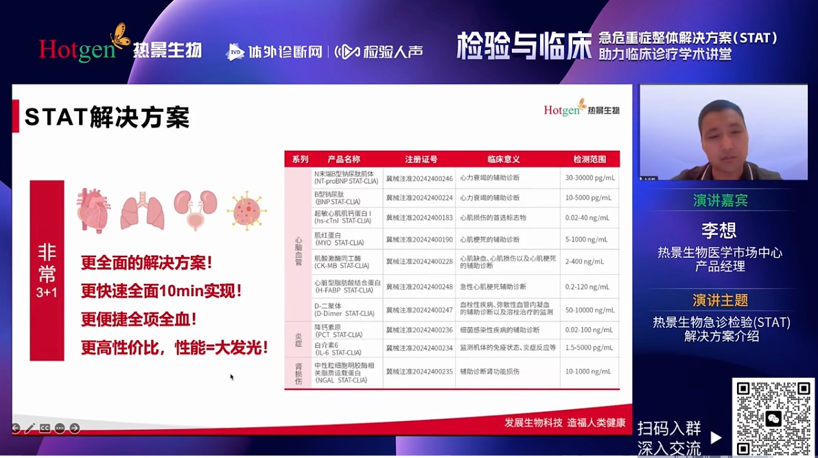 急危重症检验(STAT)作为急救医疗的重要组成部分,对于急诊重症患者在黄金时间窗内得到有效救治具有重要意义。8月9日,“检验与临床——急危重症整体解决方案(STAT)助力临床诊疗学术讲堂”在体外诊断网、检验人声等平台同步直播,会议邀请到武汉亚洲心脏病医院检验中心张真路教授、四川省江油市人民医院急诊科程缙教授分别分享hs-TnI、BNP和NT-proBNP在急危重症场景应用的新需求。热景生物医学市场中心李想经理介绍了热景生物最新推出的急危重症整体解决方案(STAT),通过线上分享交流,共同探讨急危重症整体解决方案(STAT)新思路、新方法。