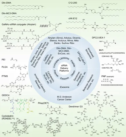 图注:经过临床前和临床评估的siRNA递送平台