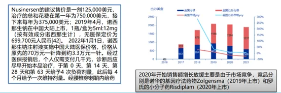 Nusinersen(诺西那生钠):2016年首次上市,由Ionis研发,是一种反义寡核苷酸(ASO),诺西那生钠注射液可以改变SMN2前mRNA的剪接,从而增加完整长度SMN蛋白的产生。2019年中国获批上市,且于2021年纳入国家医保目录。诺西那生钠可用于出生3天的婴儿到80岁的老人,适用人群非常广泛。截止到2021年,全球有11000人使用过诺西那生钠。